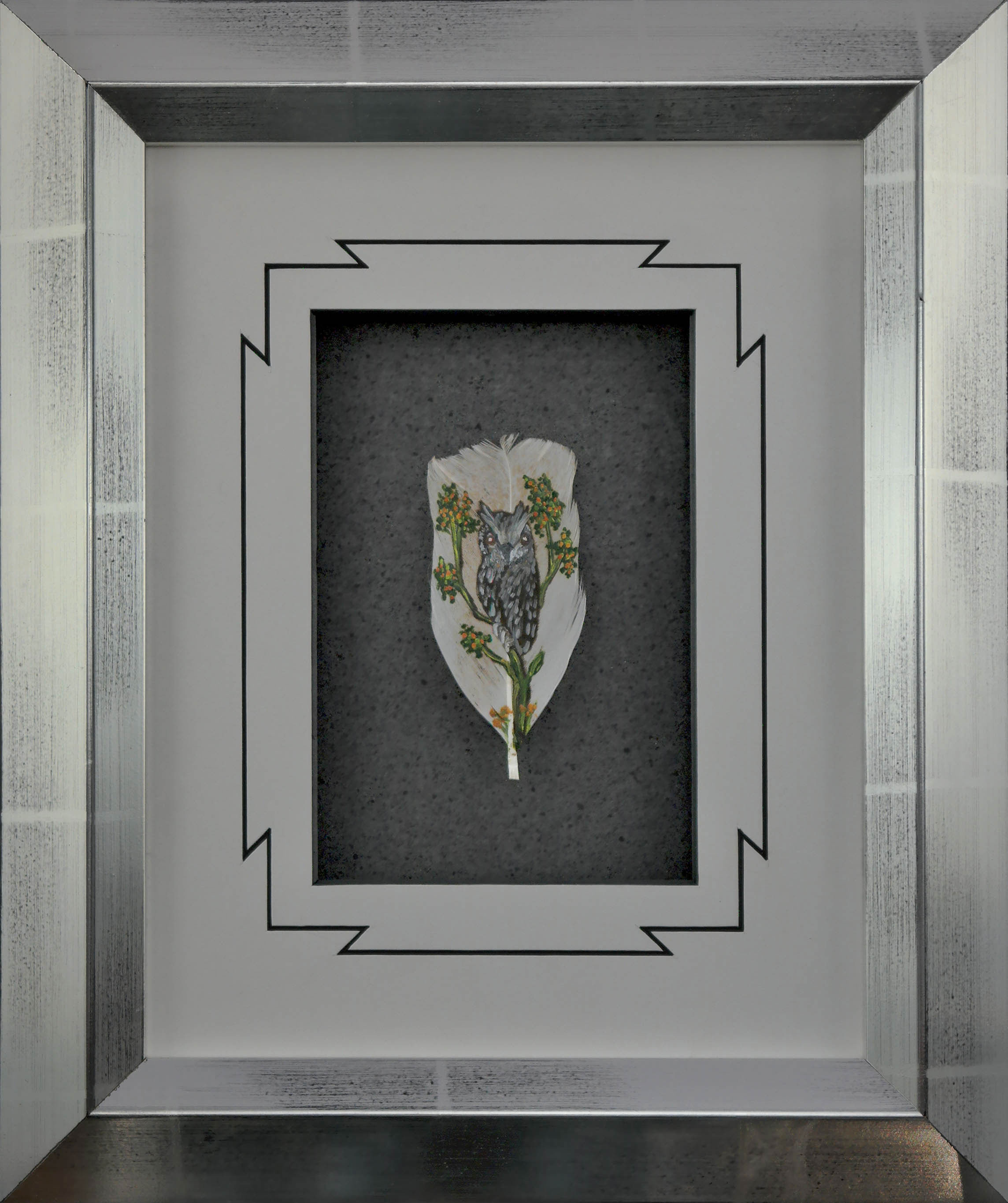 Hand painted owl feathers floating on a double layered matting featured in a sleek silver frame.