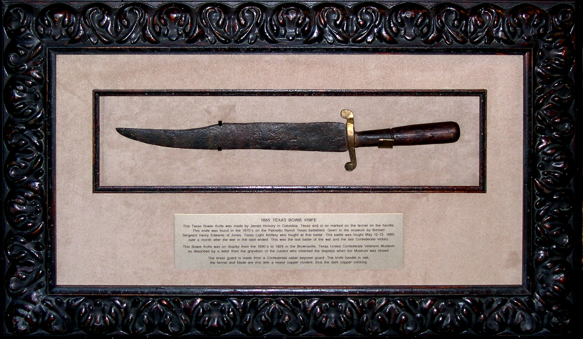 An antique knife showcased in a frame that reflects the age of the treasure.