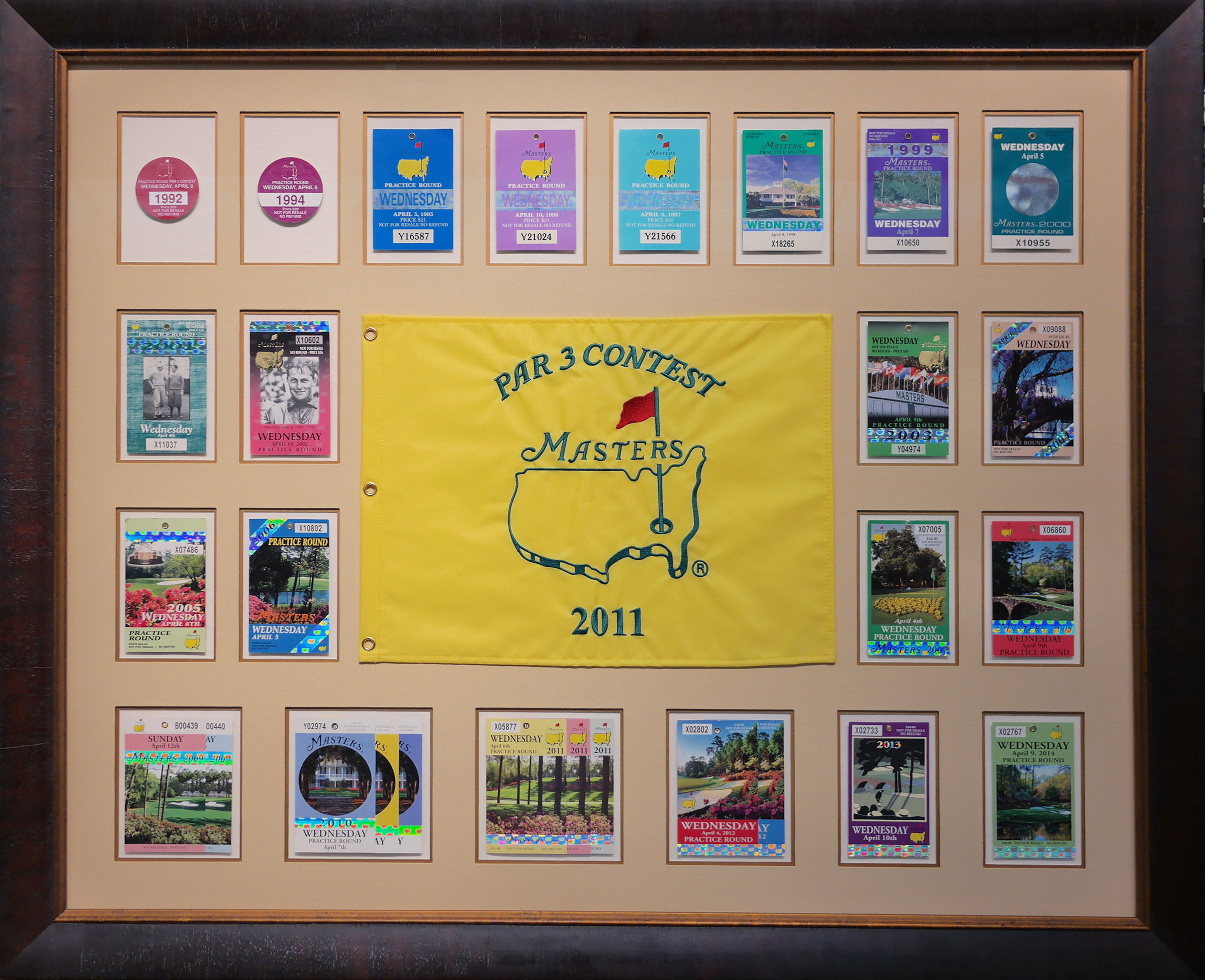 A grand collection of The Master's golf badges, representing the many years of attendance. Framed with hand-covered linen matting and a dark wood outside frame with a museum quality.